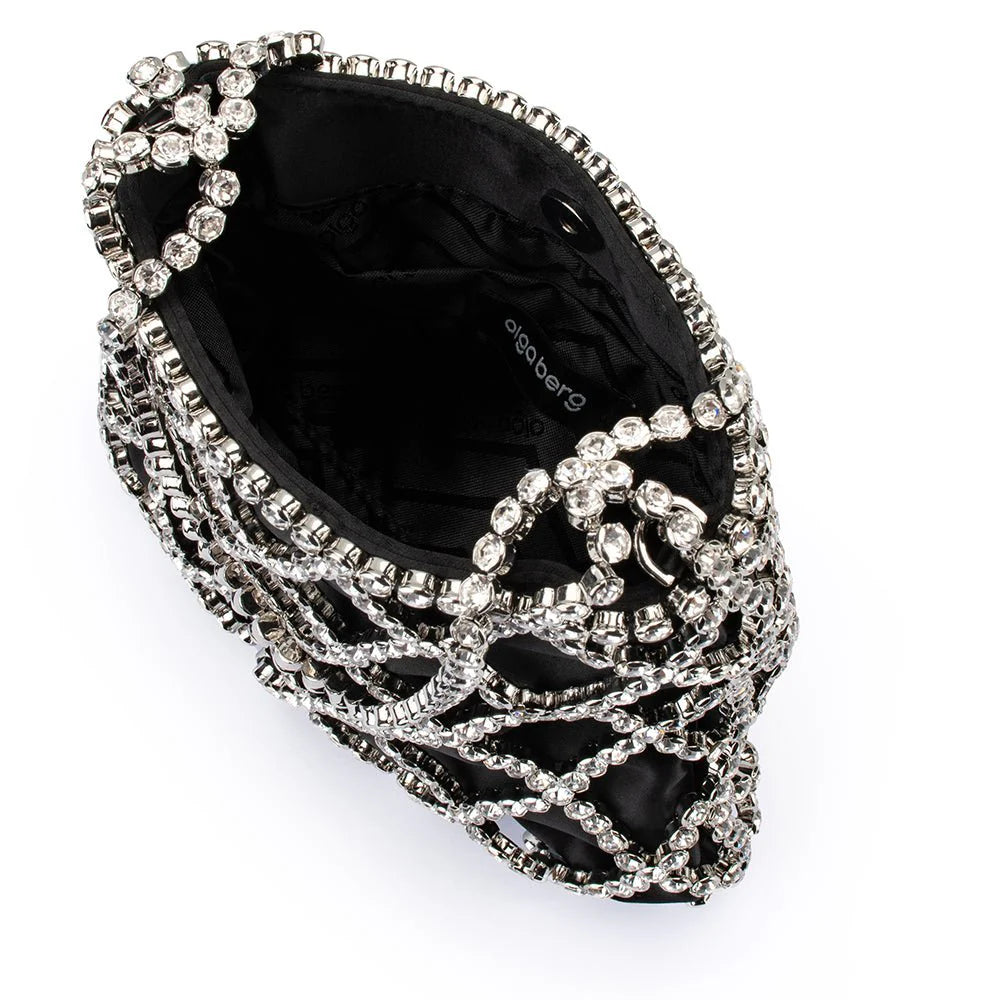 The KIT Crystal Cage top handle bag features a roomy matte satin inner lining encased in a sparkling crystal cage. The magnetic closure keeps your event essentials safe and secure, and the versatile shoulder chain can be attached for a chic on-the-go look.