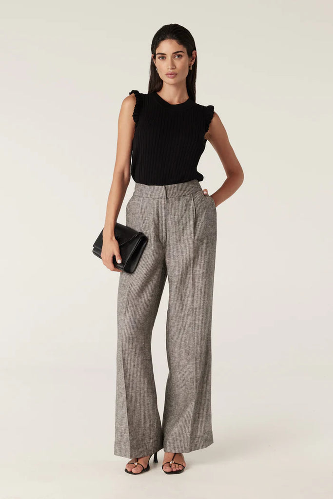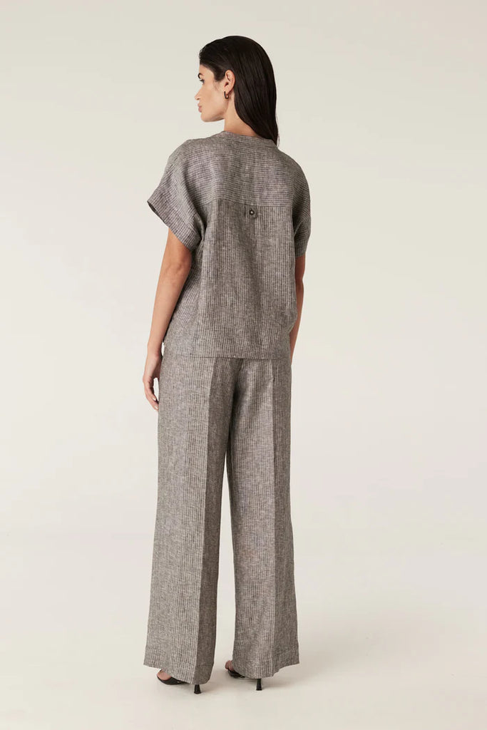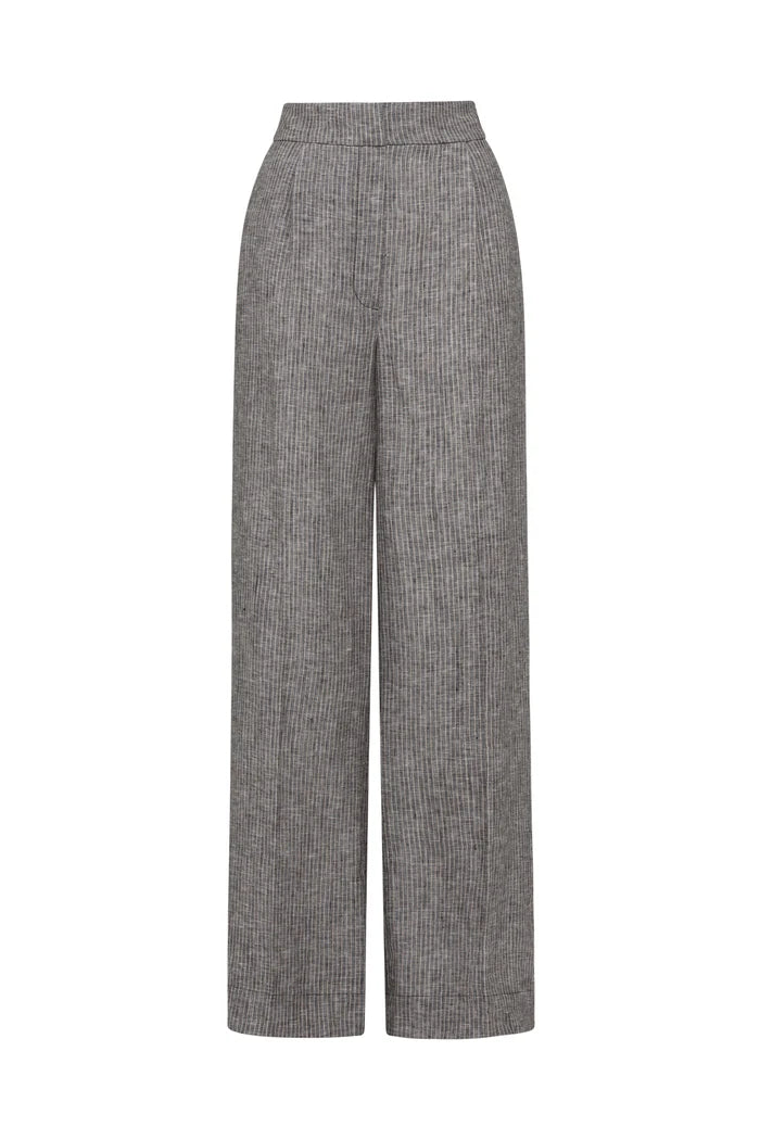 The Linden Linen Pant is crafted from pure French linen with a subtle pinstripe design. This relaxed fit style features a wide leg, zipper fly and a mock back pocket.