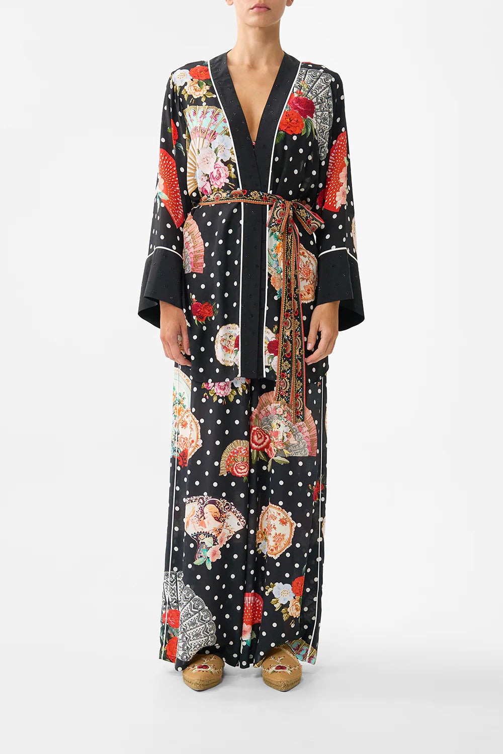 The Daughters Of Duende Short Kimono Wrap is a handcrafted silhouette designed by our in-house artisans. Imagined in an exclusive limited edition print, our silk short kimono wrap is cut in a relaxed fit with generous sleeves and side splits for ease of movement. Intentionally crafted for versatility and layering, it features a separate tie belt for effortless wear, while intricately placed crystal embellishments add luminous detail.