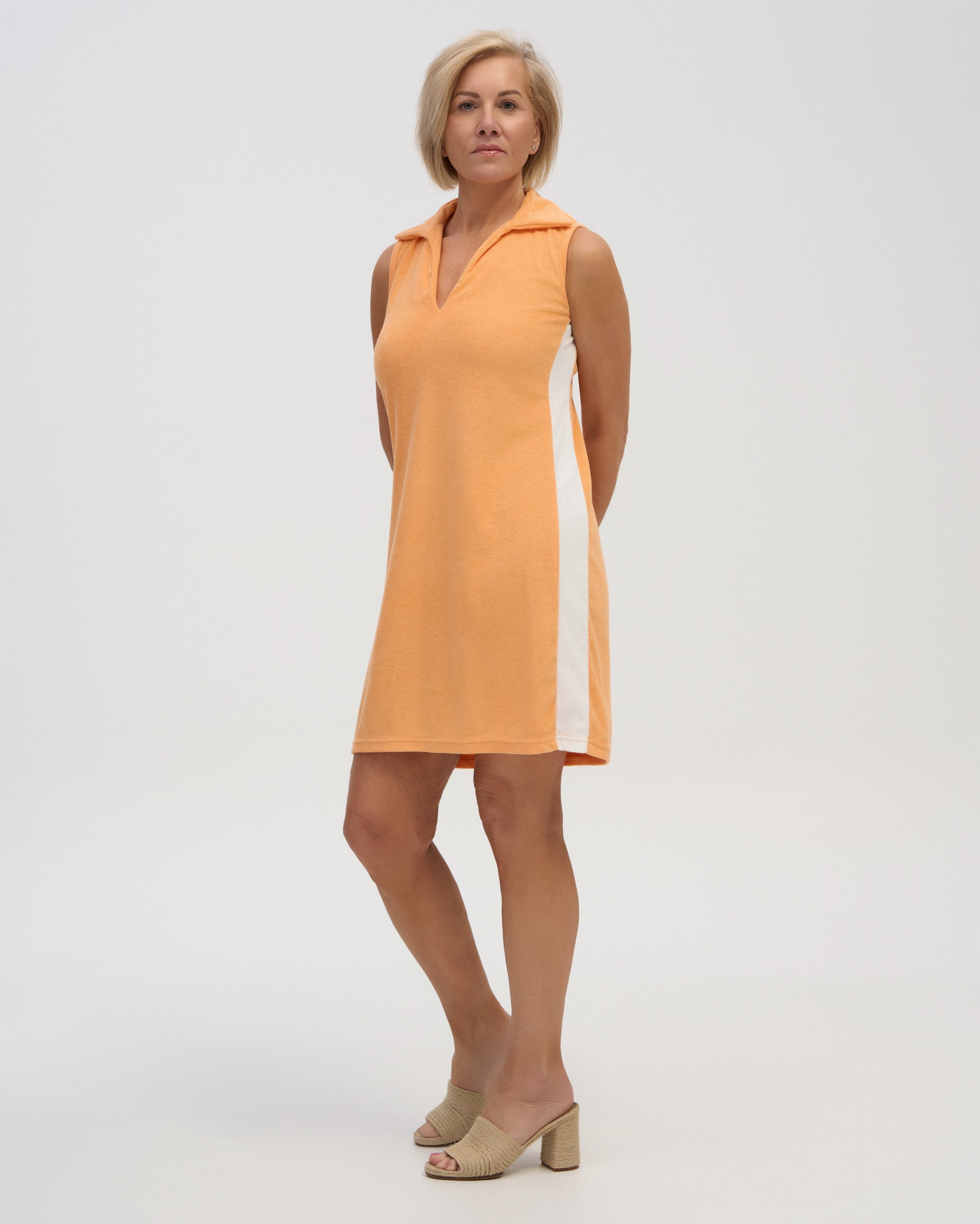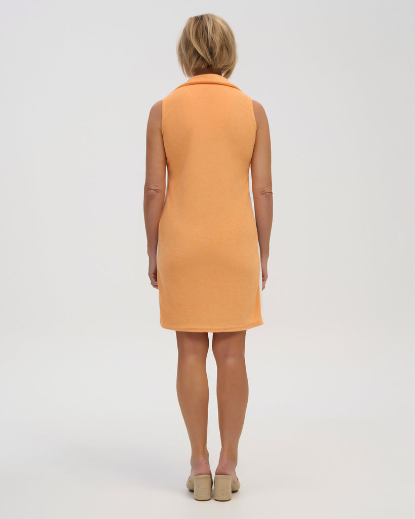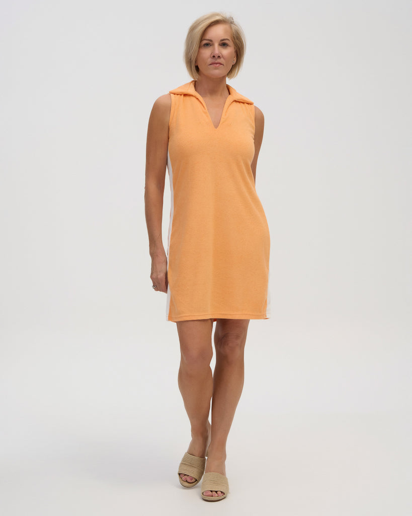 Featuring a structured collar, v-neckline and elongating side stripes this dress makes a statement in our Summer favourite, tropicana orange colour way.