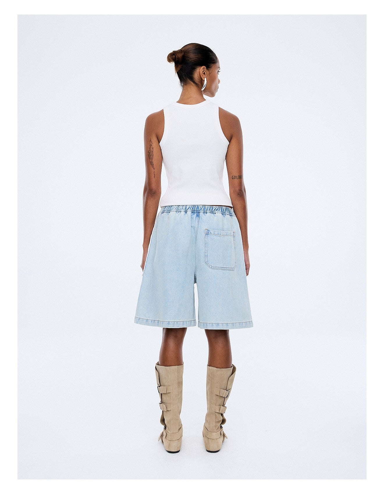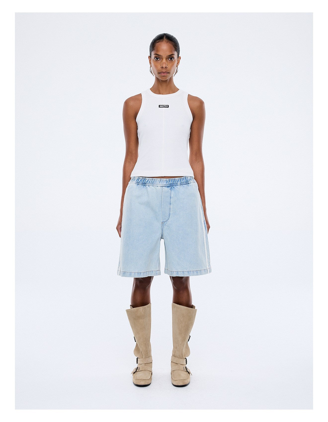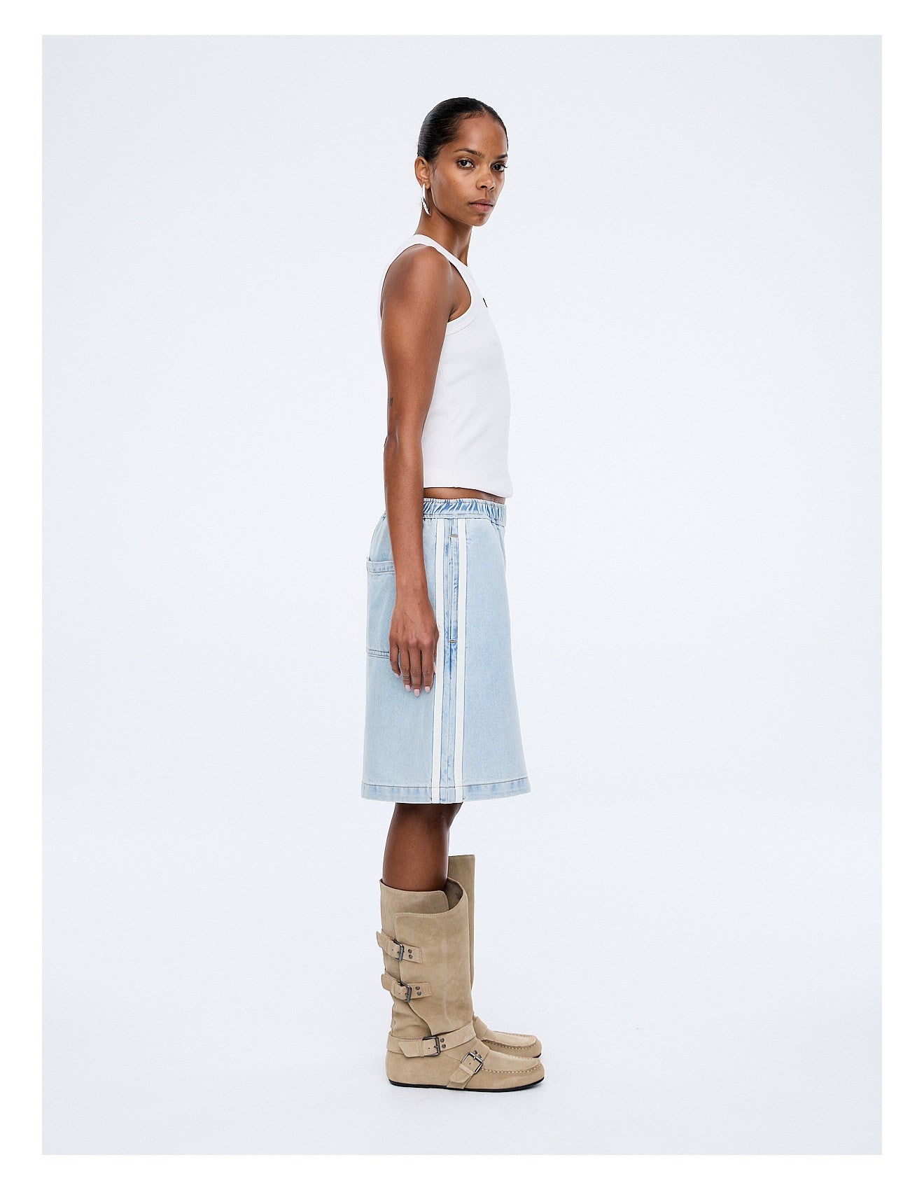 The Rosie Short is crafted from a cotton–lyocell blend denim in a light blue wash, cut to a relaxed pull-on shape that sits effortlessly on the waist. Detailed with zipped inseam pockets and contrast side stripes, bringing a soft structure to this jort-length piece.