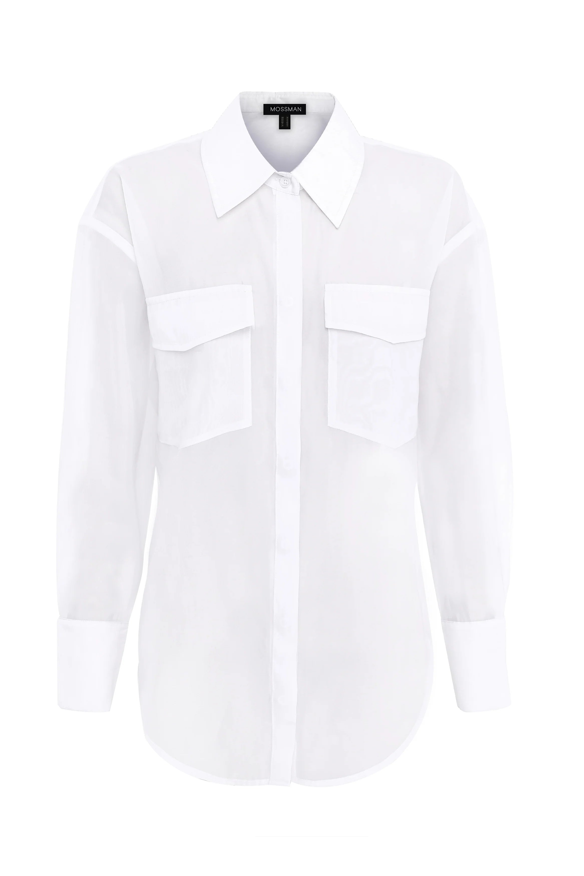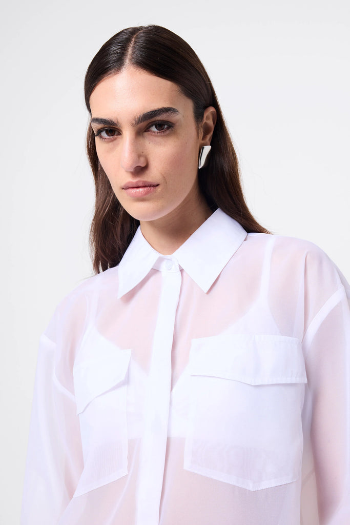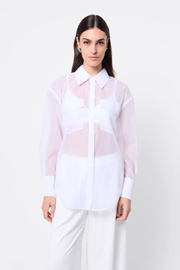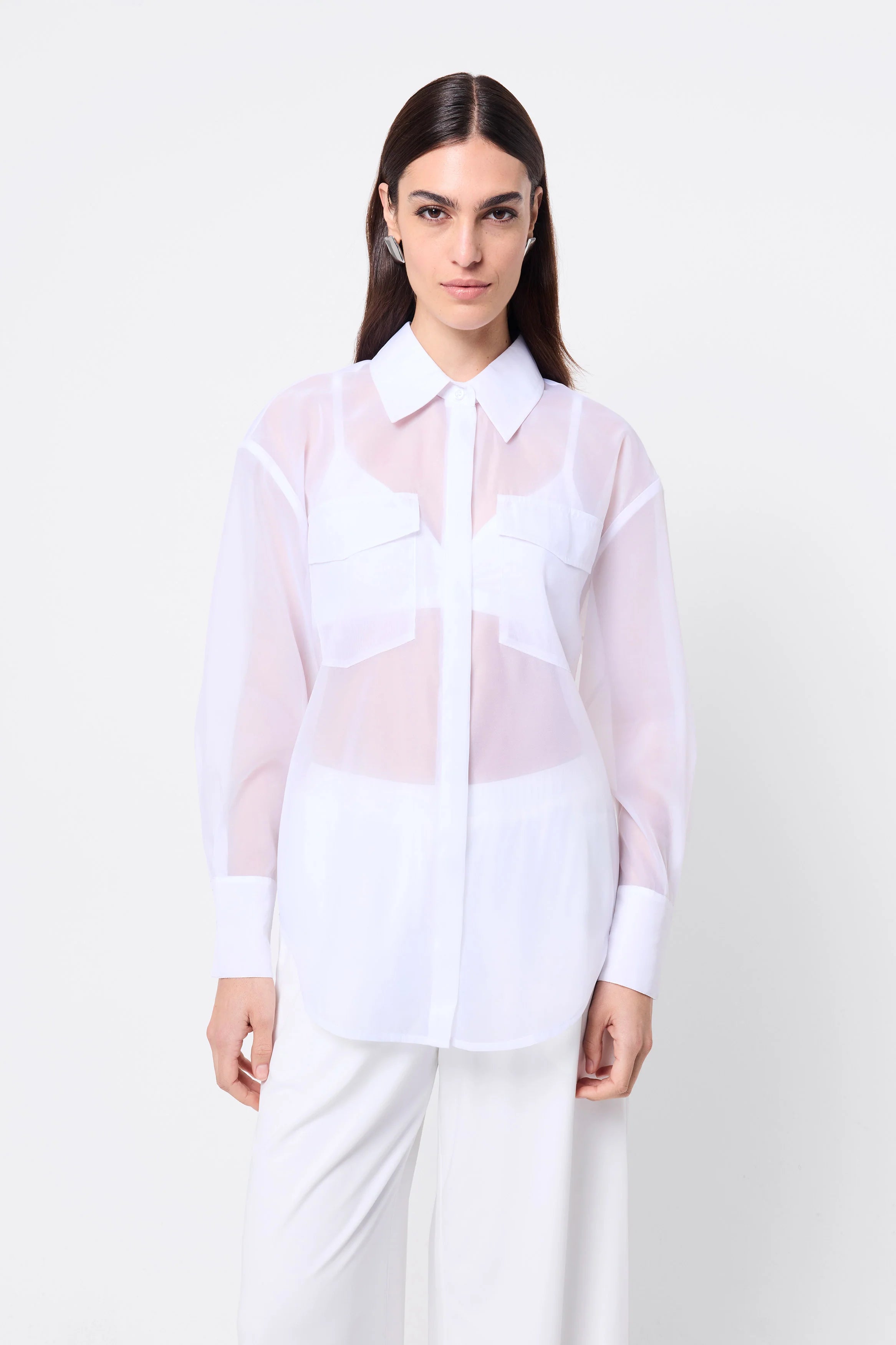 A classic silhouette, refreshed with contemporary sophistication, the Oasis Shirt in White is crafted from a lightweight organza sheer fabrication. Designed with a collared neckline, front button closure, and long sleeves with structured cuffs, this piece balances classic tailoring with modern femininity. Front patch pockets and an inverted box pleat at the back yoke lend subtle detail, while the waved hemline enhances its relaxed silhouette. Perfect for layering — wear it over a cami for understated sophistication or a bralette for an elevated, directional look.
