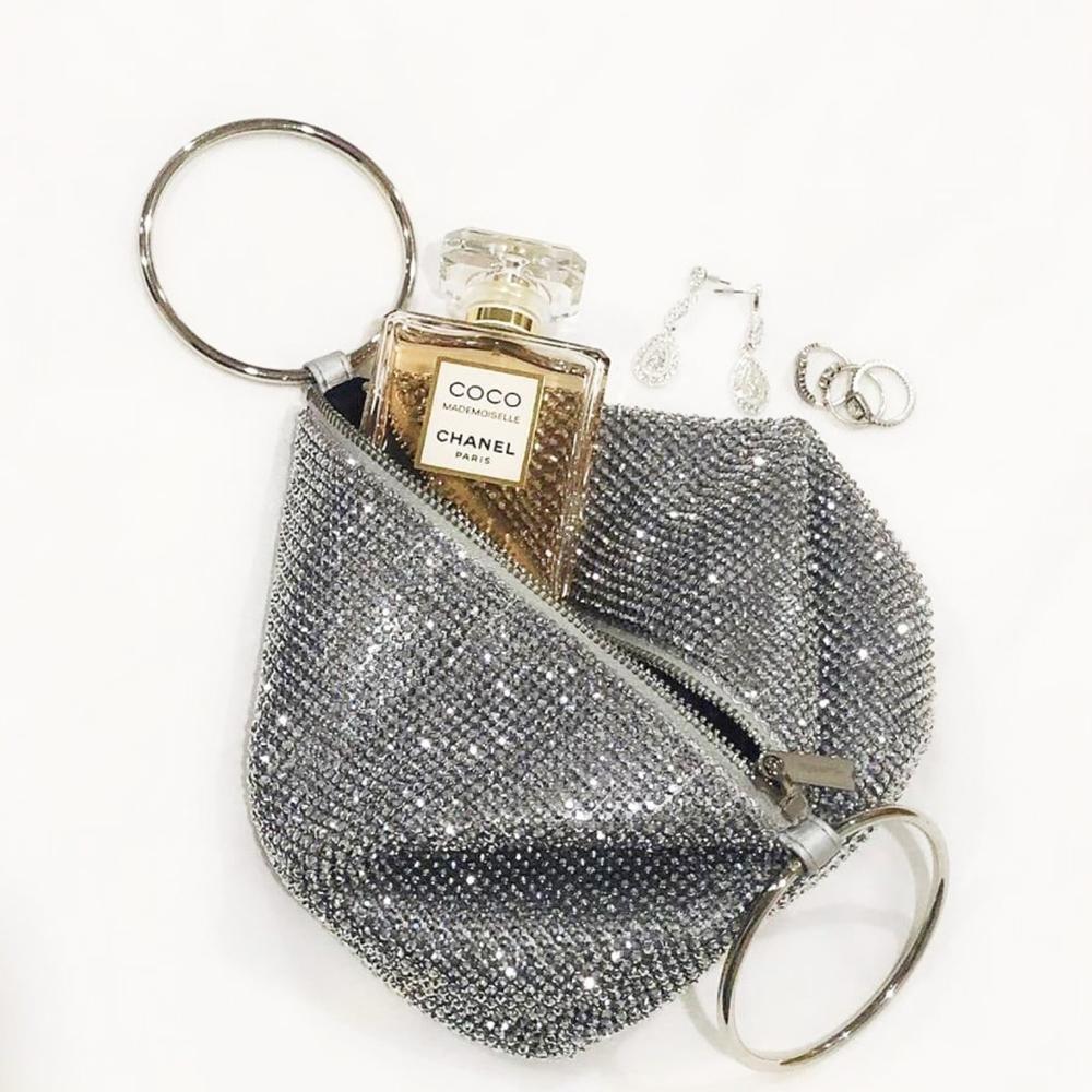 The Ellie Crystal Bag is a blinged-up sister of our best-selling Bianca Bag. Featuring a crystal mesh pouch, this roomy bag is topped with two metal ring handles. Just slide them over your wrists like bangles to go hands-free with this stunning crystal bag.