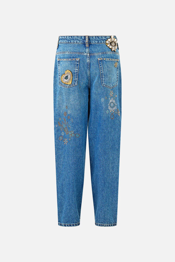 The Milla Turkiye Talisman Girlfriend Jean Denim is a handcrafted cotton silhouette designed by our in house artisans. Reimagined in an exclusive limited edition print, these embellished jeans are cut in a relaxed, straight leg cut with 5 pockets for versatility. It features handmade embellished patches and custom camilla hardware for luminous, eye catching detail.