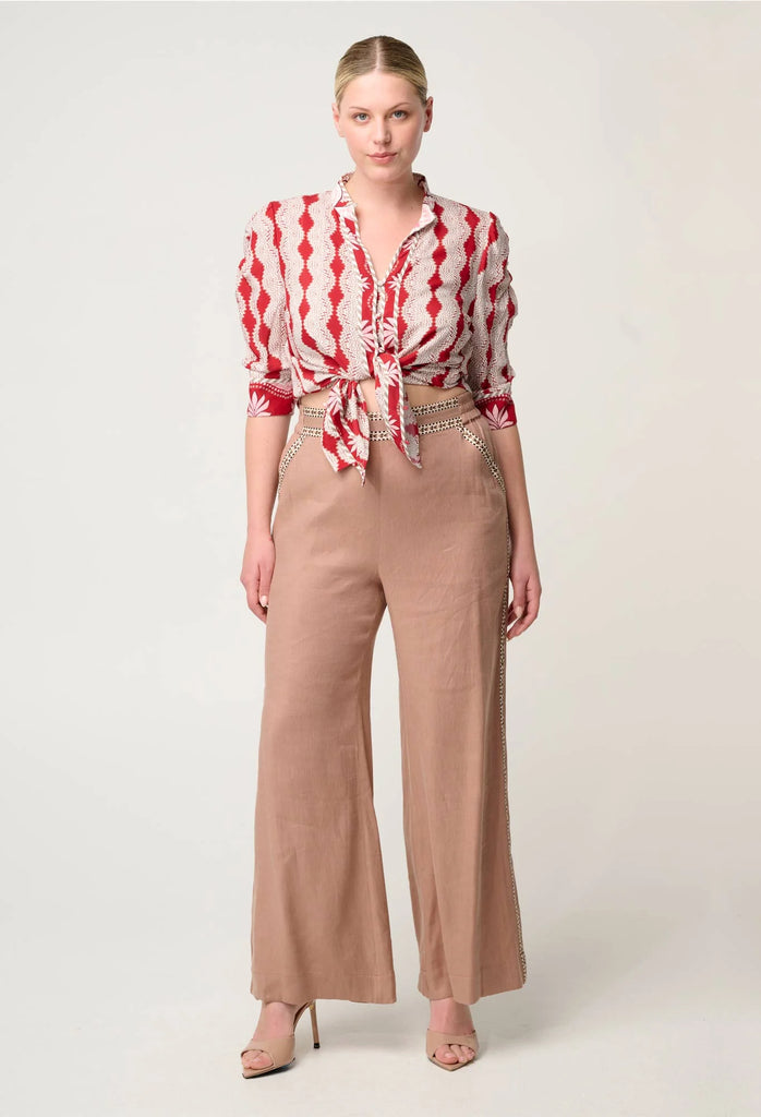 The Marrakech Ruby print—a bold fusion of ruby red and soft ivory in a statement geometric pattern—captures effortless confidence with a touch of bohemian charm. Crafted from lightweight viscose, the Calantha Shirt features a button-down front, soft collar, and subtly ruched sleeves for a refined yet relaxed look.
