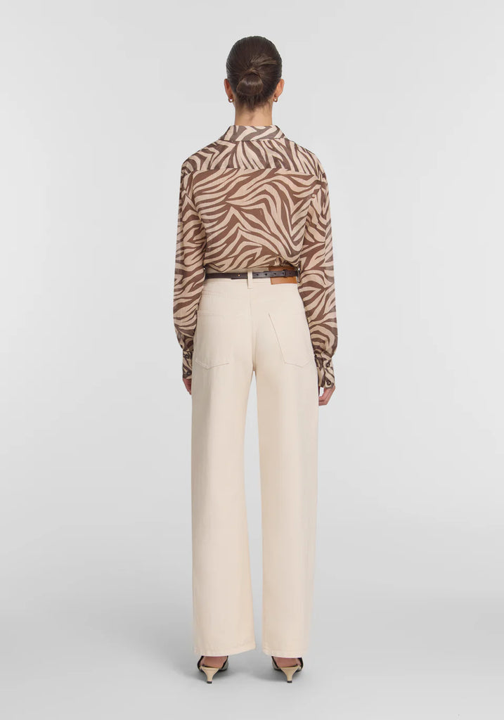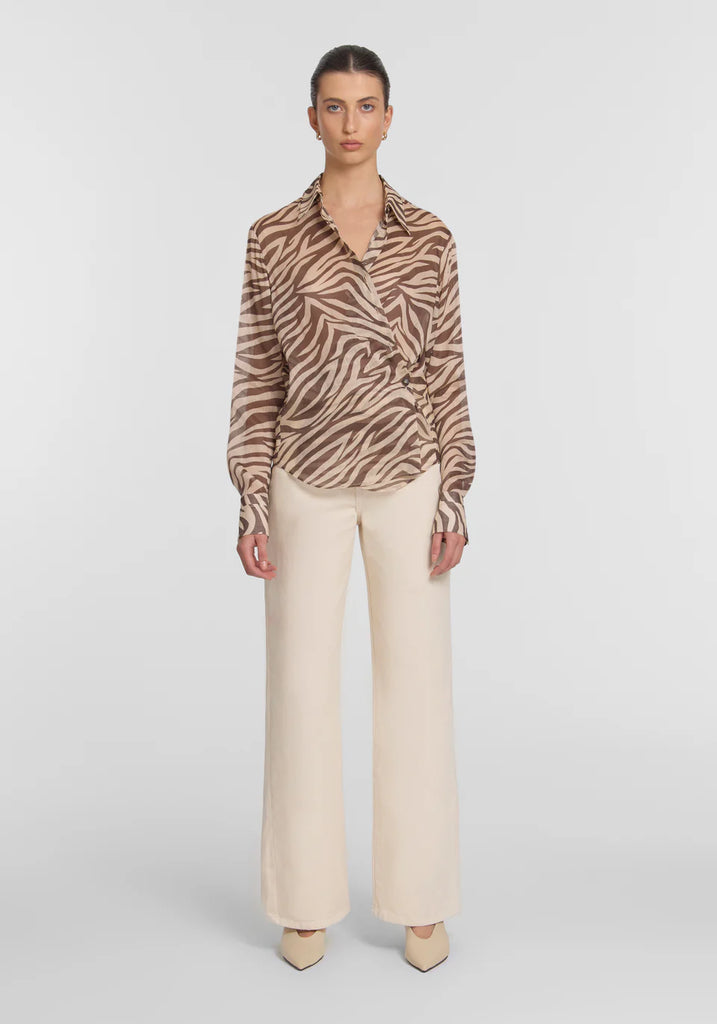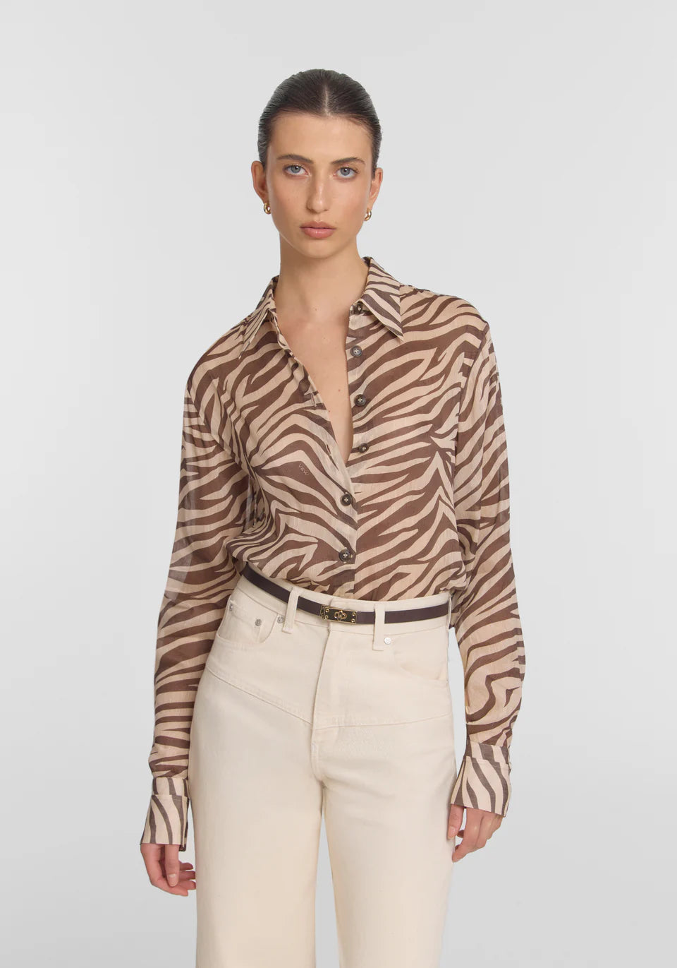 The Irresistible Shirt, crafted from a luxurious linen-silk blend in zebra print, makes a soft statement, showcasing the delicate interplay between print and sheer textile. With traditional shirt detailing, it features an optional modern wrap detail secured with a side seam button.