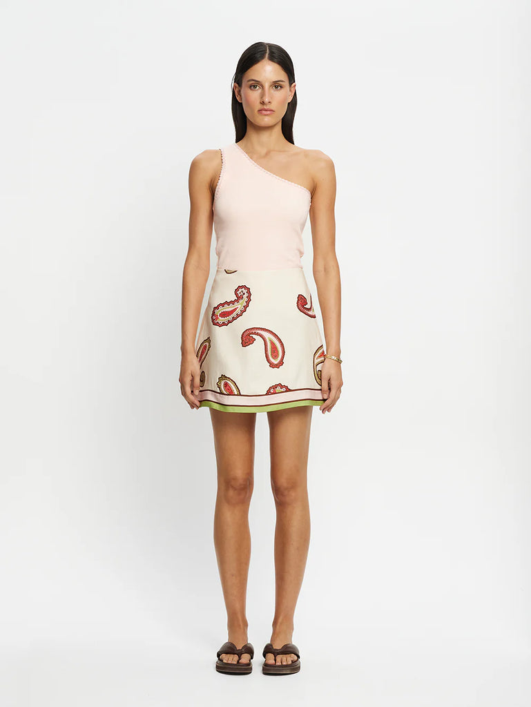 Eden is a vibrant paisley print featuring intricate motifs in red, pink, and green tones set against a light neutral base. The Eden Mini Skirt is an A-line skirt shape framed with a lime green band with contrast stripe across the hem. Style with the matching Eden Shirt for a coordinated look.