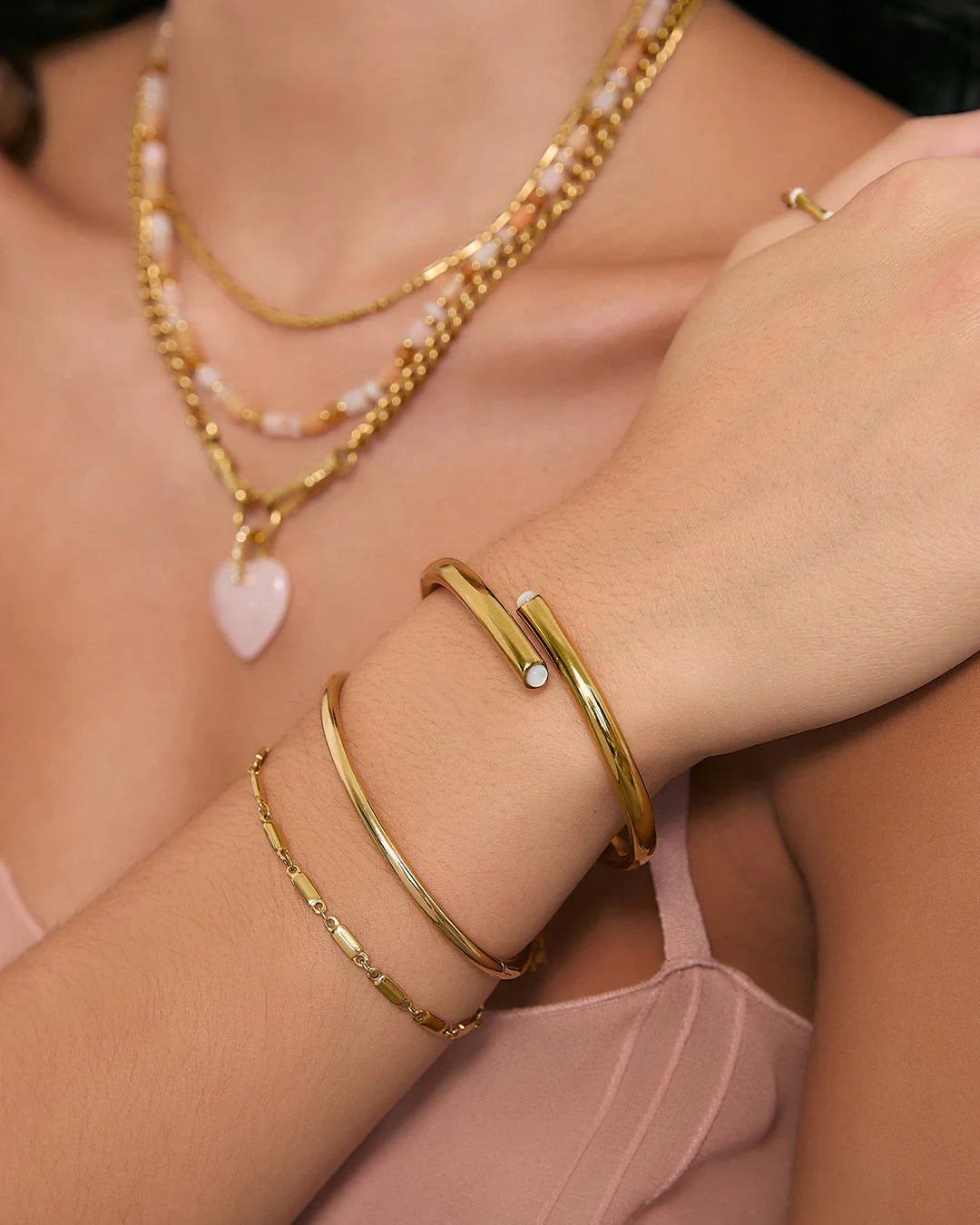 Enchanting statement style is here with the Reya Cuff, a golden beauty finished with luminous Mother of Pearl. With its unique sculptural silhouette and one of a kind vibe, Reya is the perfect piece to elevate your event look.