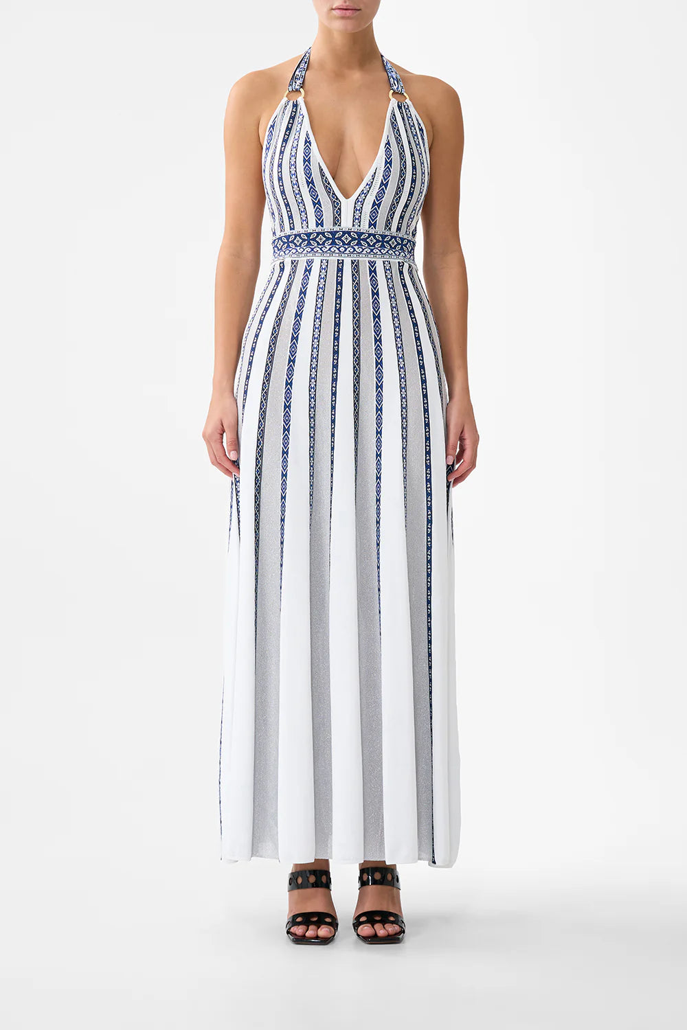 Curated by Ellery & Moss, The Camilla A Tiled Wonderland Halter Neck Knit Dress With Silk Tie is a handcrafted silhouette designed by in-house artisans. This knit maxi dress pays homage to the feminine form. It features intricate panel detailing, adding fluidity to the skirt. The halter ties adorn the décolletage as a fitted waistband cinches and shapes.
