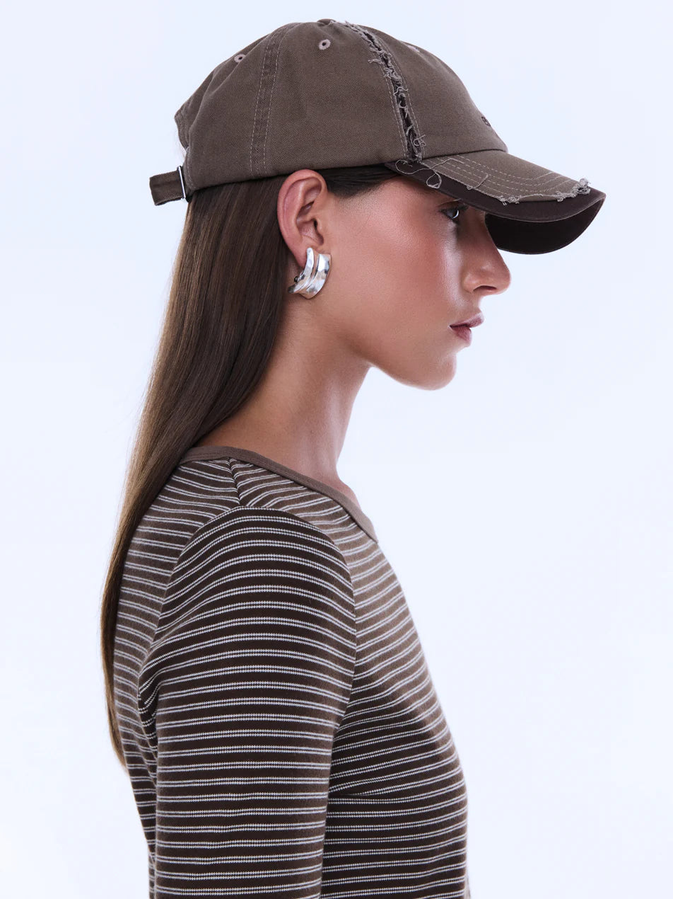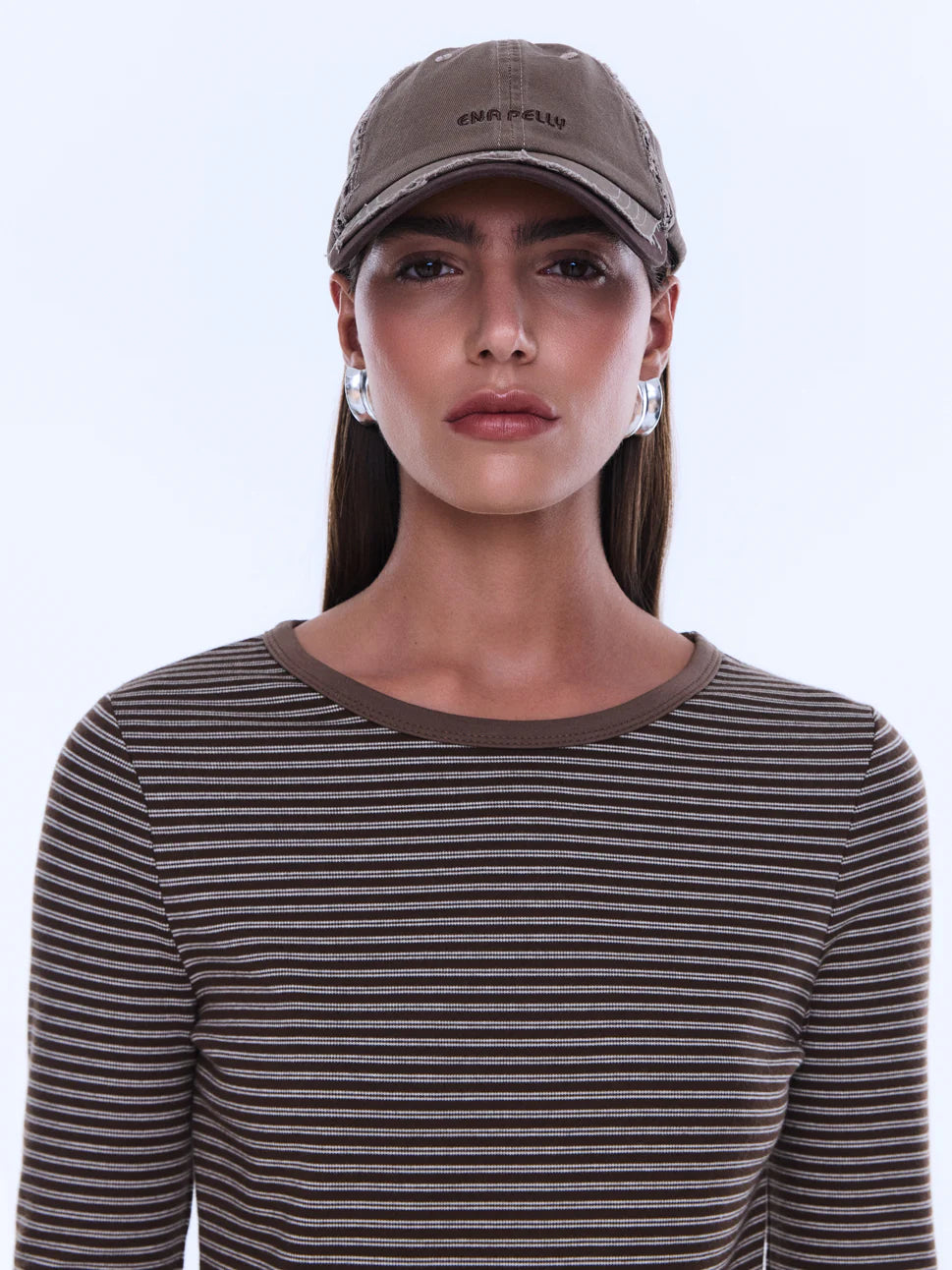 The EP Distressed Cap is crafted from Cotton with a vintage-style five-panel shape in light mocha. Finished with subtle distressing and tonal Ena Pelly embroidery, it delivers relaxed attitude with everyday versatility.