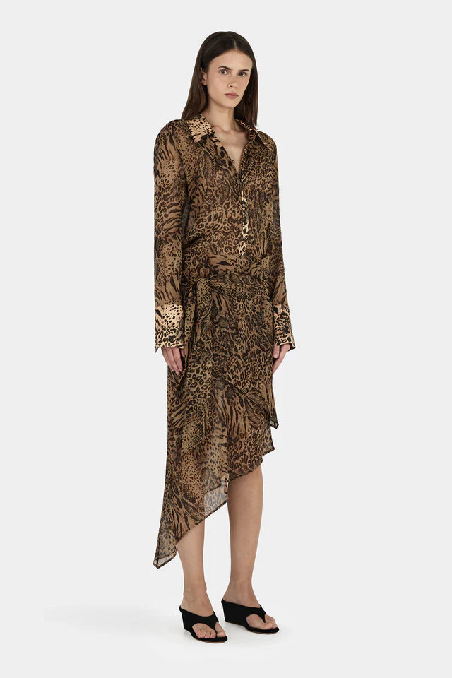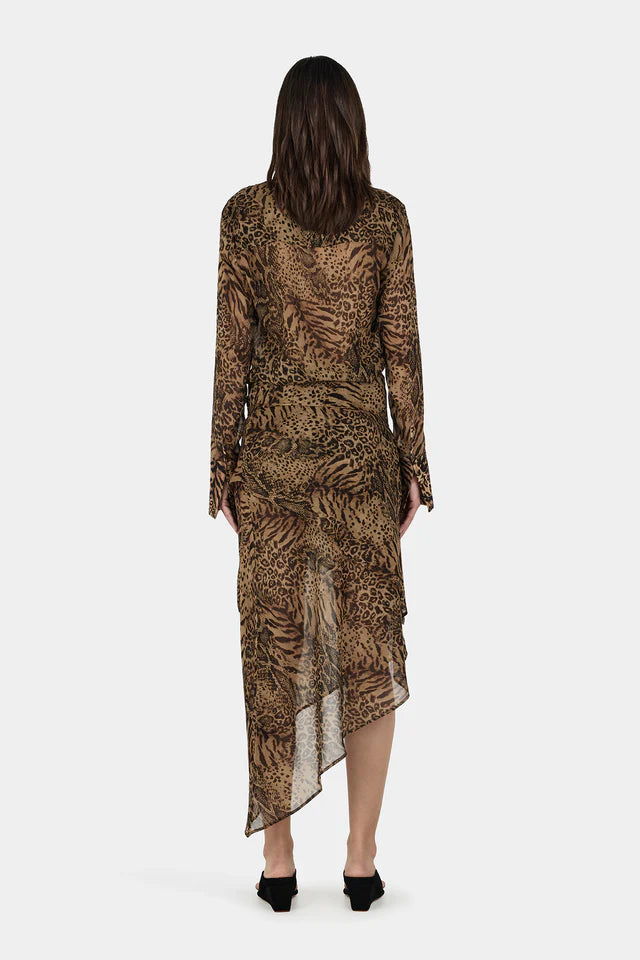 The Mahitha Blouse is an oversized button-down with a classic collar and scooped back hemline. Lightweight and sheer, it offers a relaxed, airy silhouette perfect for layering or standalone styling.