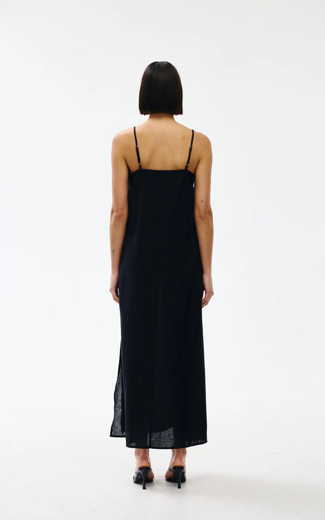 The Cali Dress in Black is a timeless addition to your wardrobe. Designed in a relaxed, A-line silhouette, it features a flattering straight neckline, adjustable straps, and subtle side splits for ease of movement.