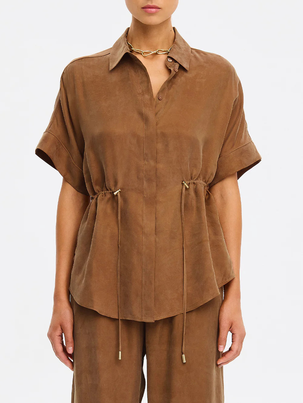 Curated by Ellery & Moss, the Jaxon Top in chocolate brown is a relaxed silhouette featuring short sleeves and a concealed button-down front, complete with adjustable drawcords at the waist for a softly defined shape. Designed for ease and versatility, it blends relaxed tailoring with refined simplicity.