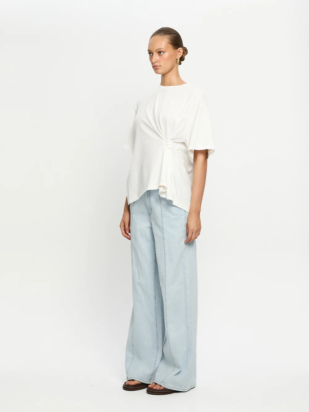 Curated by Ellery & Moss, the Vera Asymmetrical Tee is crafted in 100% Organic Cotton and has an oversized, boxy silhouette featuring short sleeves, long side splits, complete with a gathered pleat detail with contrast brown stitching that adds subtle shape. Soft and breathable, it offers an effortless approach to everyday dressing.