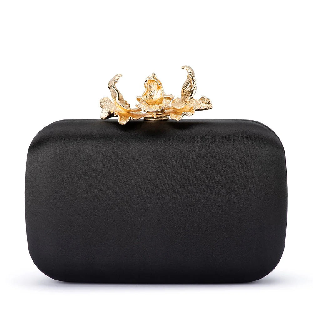 The ADELE Orchid Lock Clutch is the ultimate statement bag. Crafted from a luxe matte satin fabrication and embellished with a stunning orchid fastening, this clutch will ensure your look is the epitome of sophistication. Fits a smart phone and all your evening essentials.