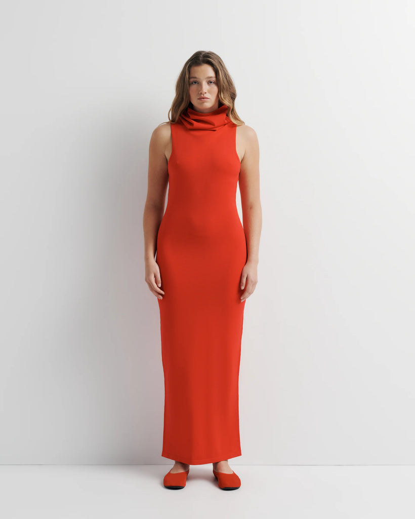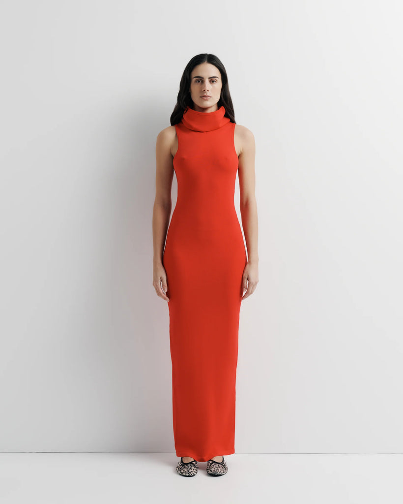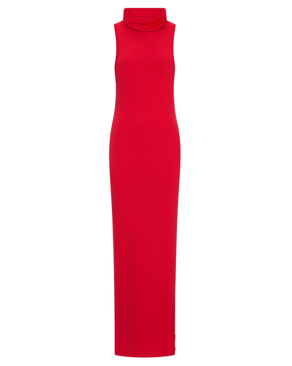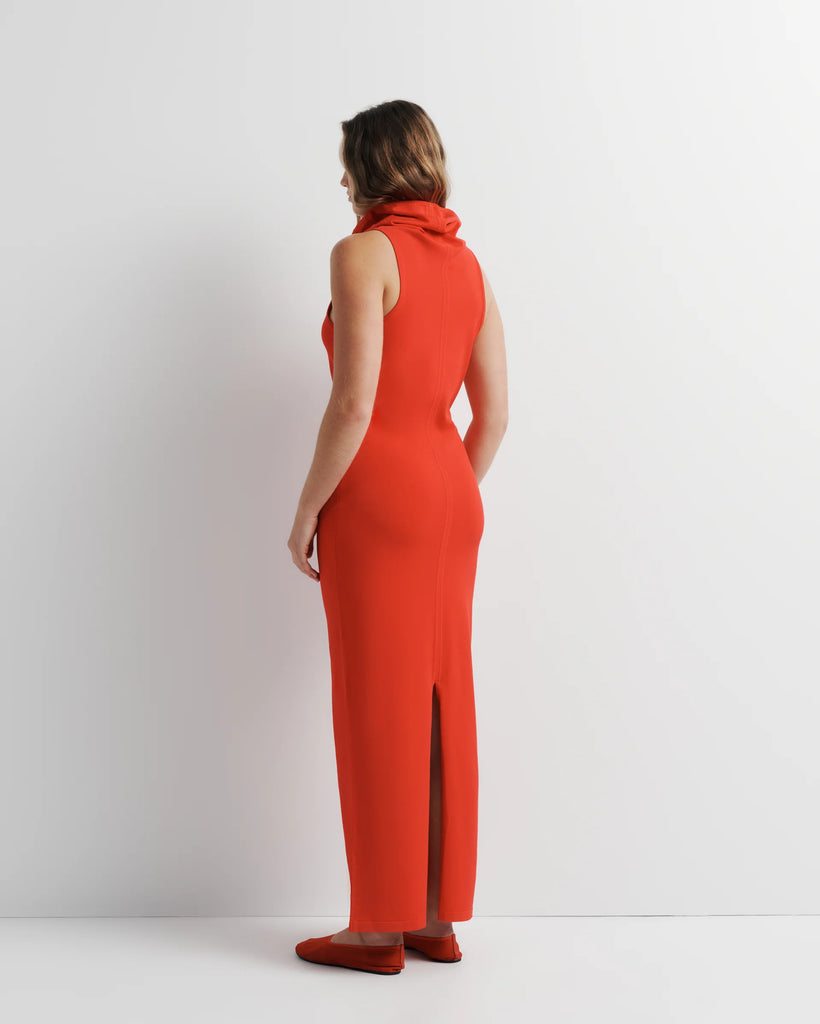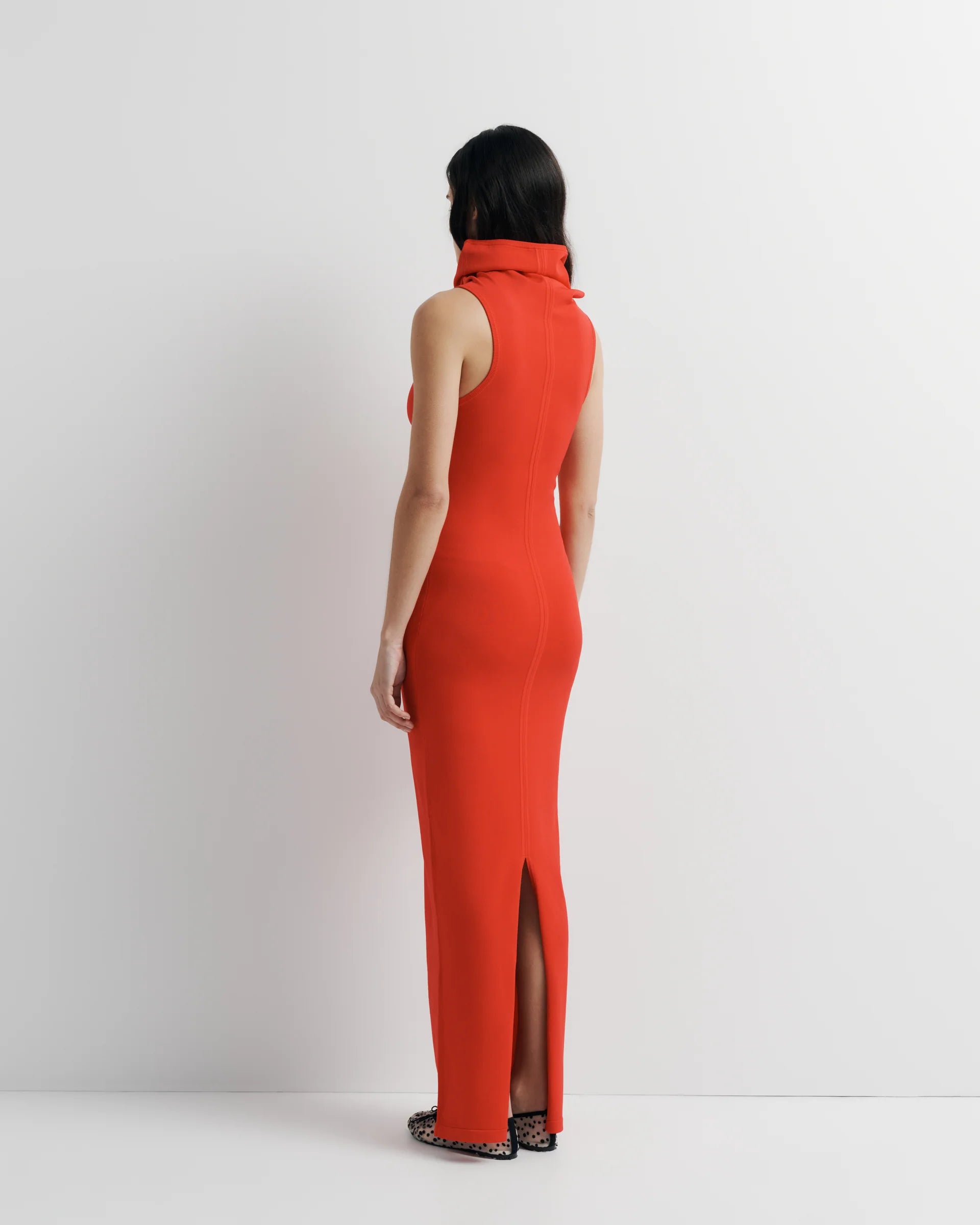 A crepe knit sleeveless maxi dress with an exaggerated and relaxed funnel neck and back split.
