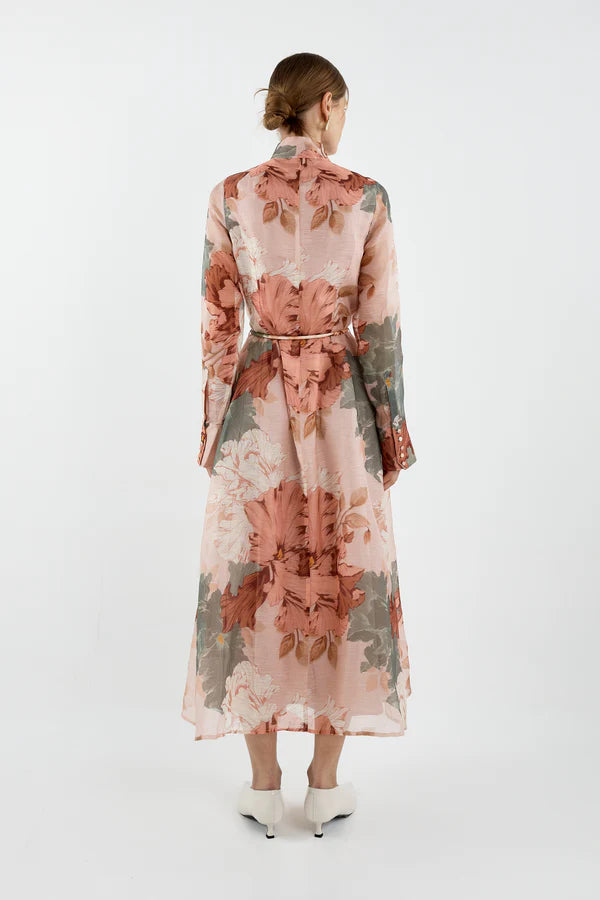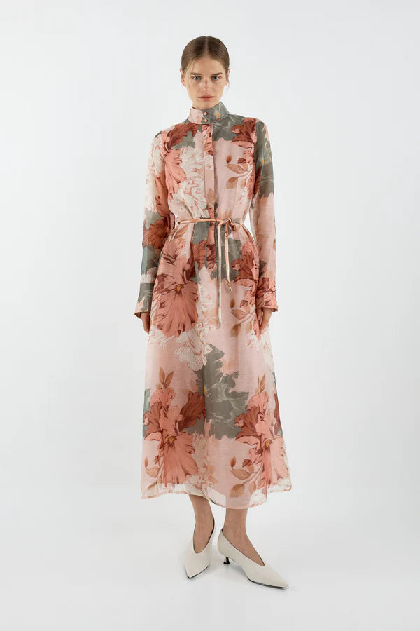 Curated by Ellery & Moss, the Iris Shirt Dress is crafted from a silk linen blend in a striking print, this midi classic dress features a collar stand, a removable self tie rope belt, a placket down the centre front is long sleeved with a bell sleeve button up cuff.Â